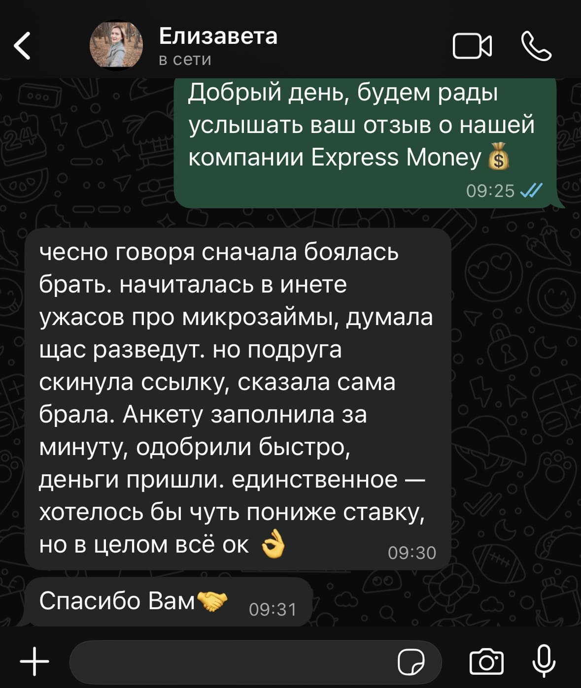 Когда я искала, где оформить ссуду, выбор пал на Express Money, и ни разу не пожалела. Все прошло гладко: от подачи заявки до получения денег. Особо хочется отметить, что менеджер отзывчивый и внимательный к деталям, помог выбрать оптимальный вариант, исходя из моих нужд.