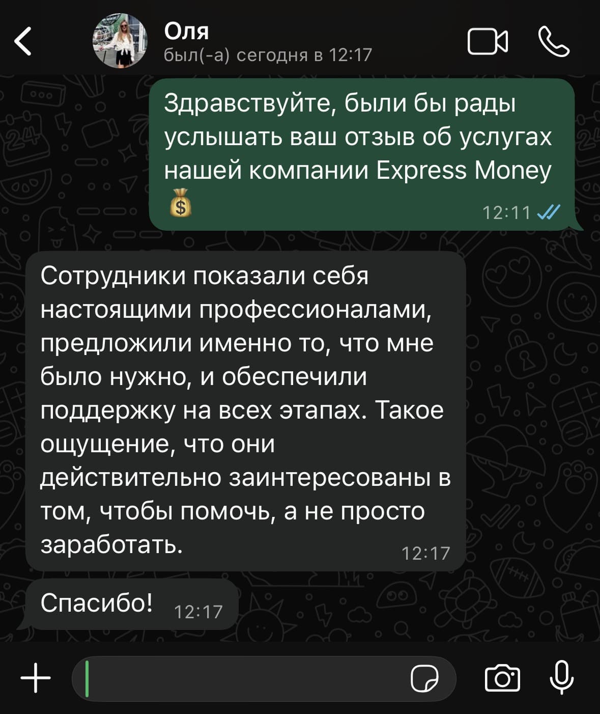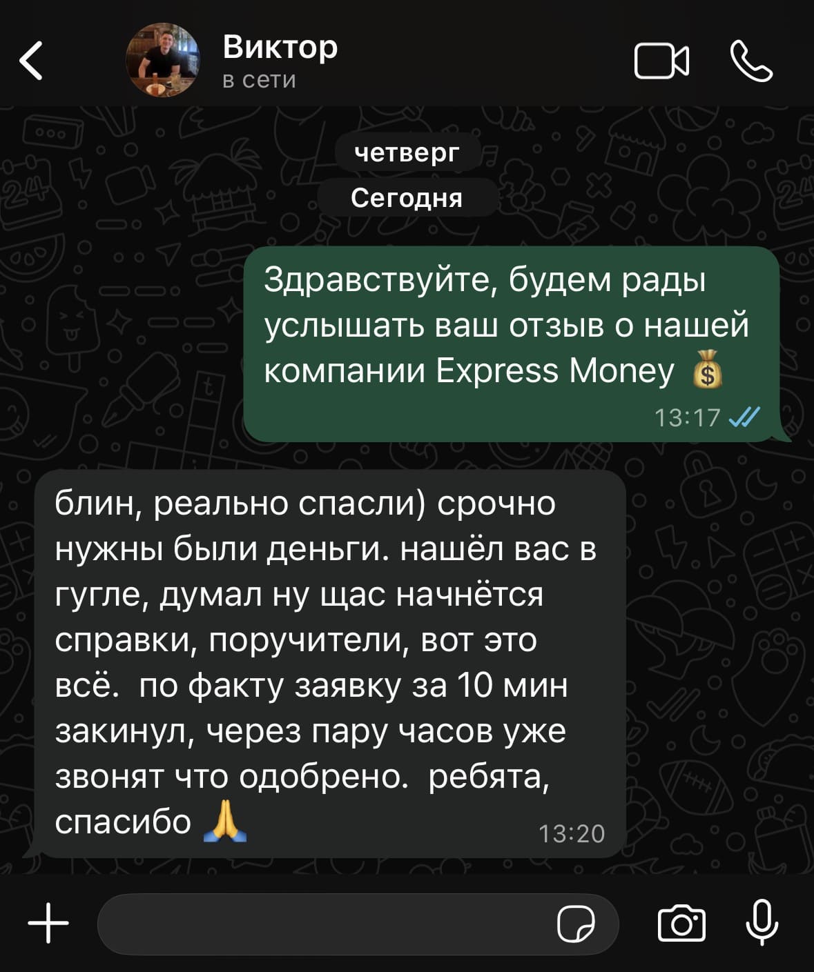 Был в ситуации, когда нужны были срочные деньги. Наткнулся на Express Money, подал заявку и, честно говоря, был удивлен. Оформили за несколько часов, без кучи бумажек и заморочек. Дали на условиях которые не выжимают из тебя последние соки. Спасибо за оперативность и человеческий подход.